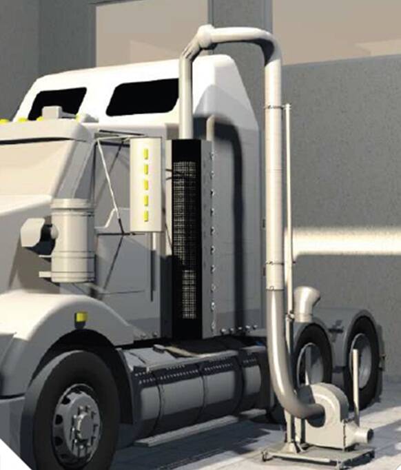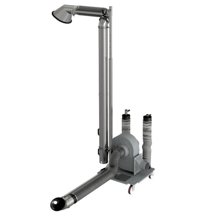 Przestawny odciąg spalin do pojazdów przemysłowych do podwójnego zastosowania na pionowych i podwoziowych rurach wydechowych.